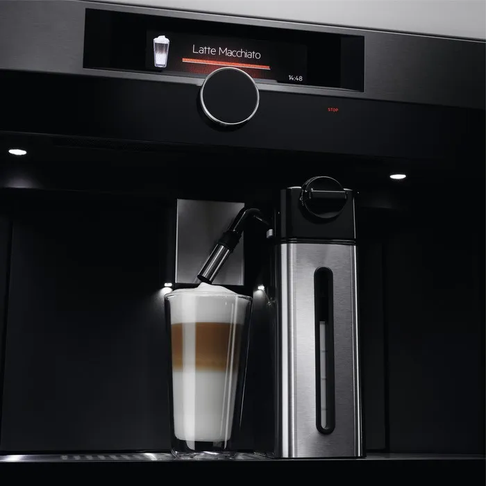 Elegancki ekspres do kawy do zabudowy z funkcją Autostart i opcją MultiCup, kolor czarny matowy.